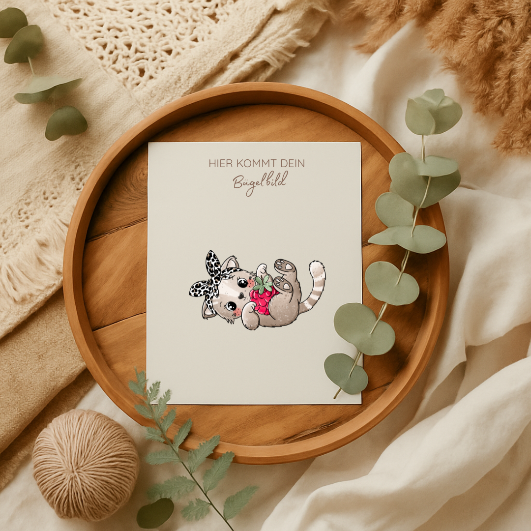 3. Bügelbild auf dem Textil platzieren. Das Motiv zeigt nach oben, die weiße Seite liegt auf dem Textil. Bild mit Backpapier bedecken.