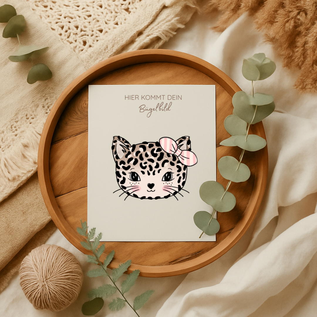 3. Bügelbild auf dem Textil platzieren. Das Motiv zeigt nach oben, die weiße Seite liegt auf dem Textil. Bild mit Backpapier bedecken.