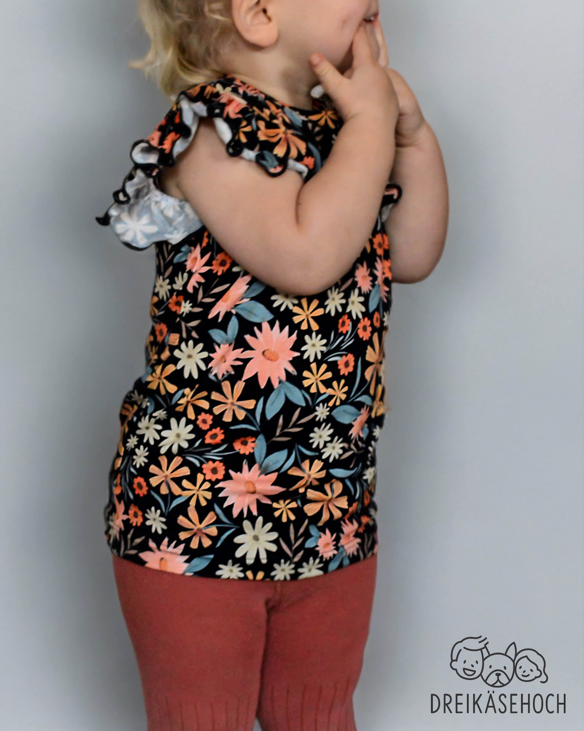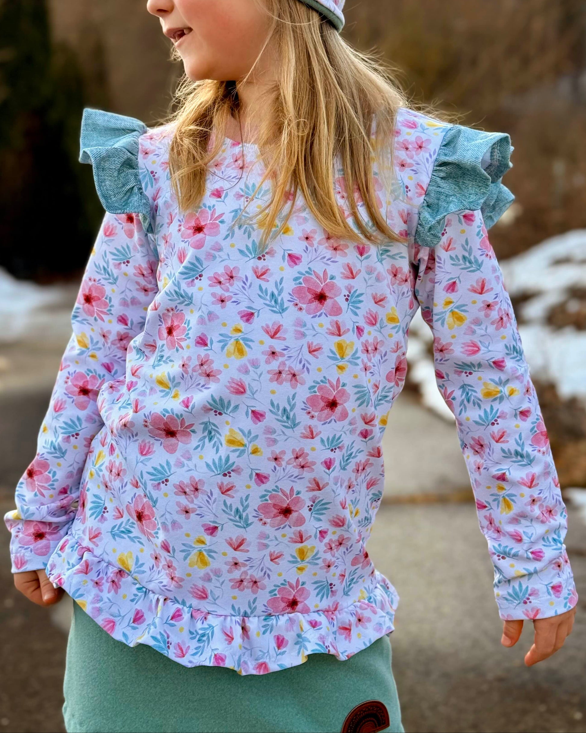Genäht wird der Schnitt aus Jersey. Mit kleinen Größenanpassungen eignen sich auch Rippjersey oder French Terry.