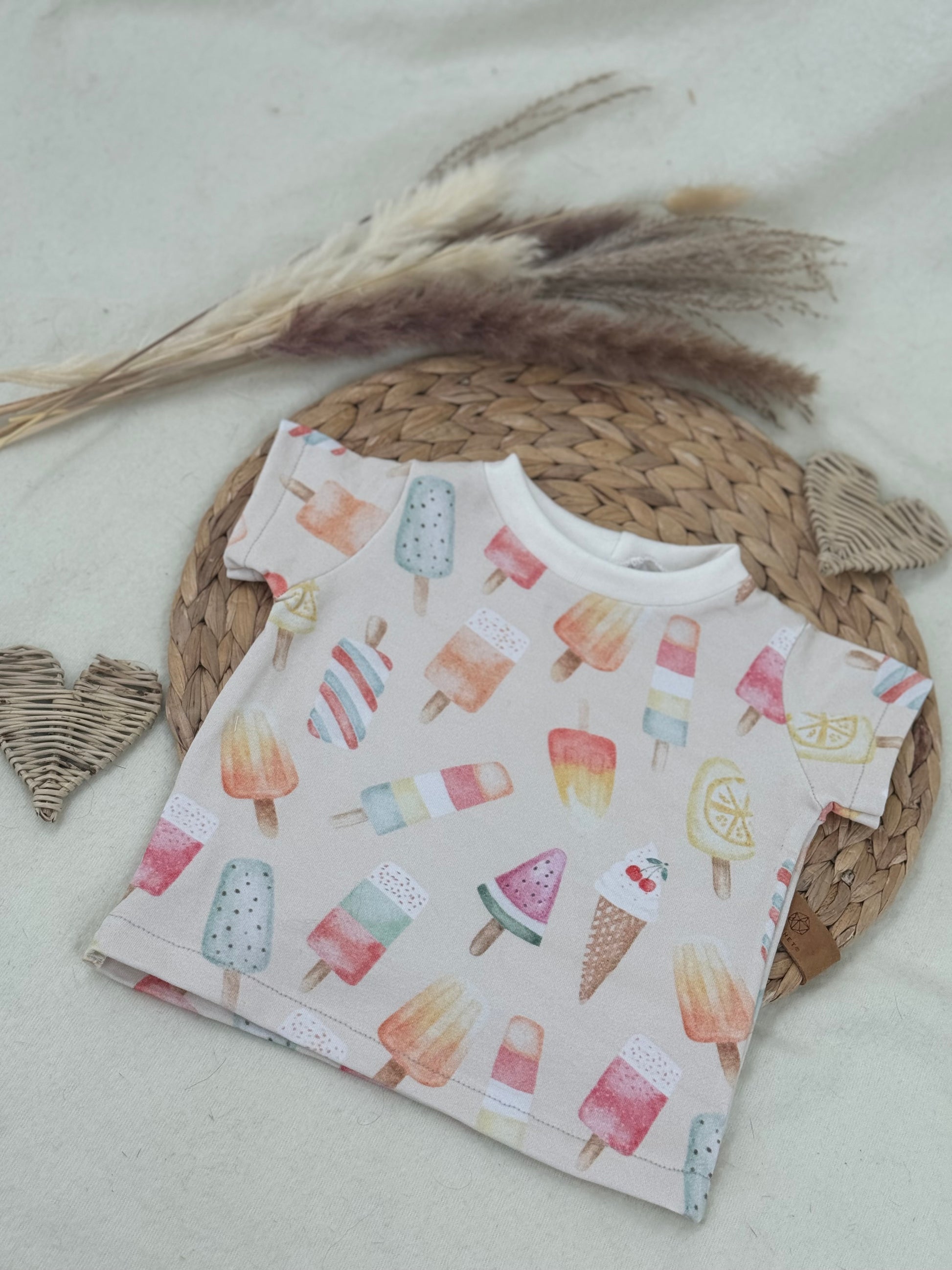 Süßer geht’s kaum! Dieses handgemachte Baby T-Shirt in Größe 62 kommt mit einem sommerlichen Eis-Motiv daher und bringt sofort Laune in den Kleiderschrank. Perfekt für warme Tage, erste Ausflüge oder einfach zum Anbeißen süß aussehen!